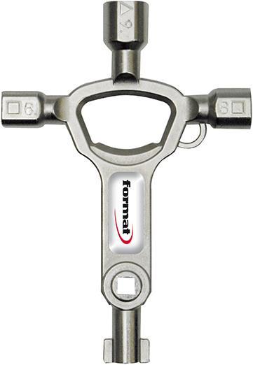 Modèle : en zinc moulé sous pression, en forme de croix. Avec embout double à fente 7 mm/empreinte cruciforme PH 2, quatre pans étagé de 6 ; 7 ; 8 mm ; tête triangulaire mâle de 7 ; 9 ; 10 mm, double panneton de 3 à 5 mm et clé carrée pour vanne de radiateur de 5 mm, avec décapsuleur. Livré avec un adaptateur en plastique 1/4".