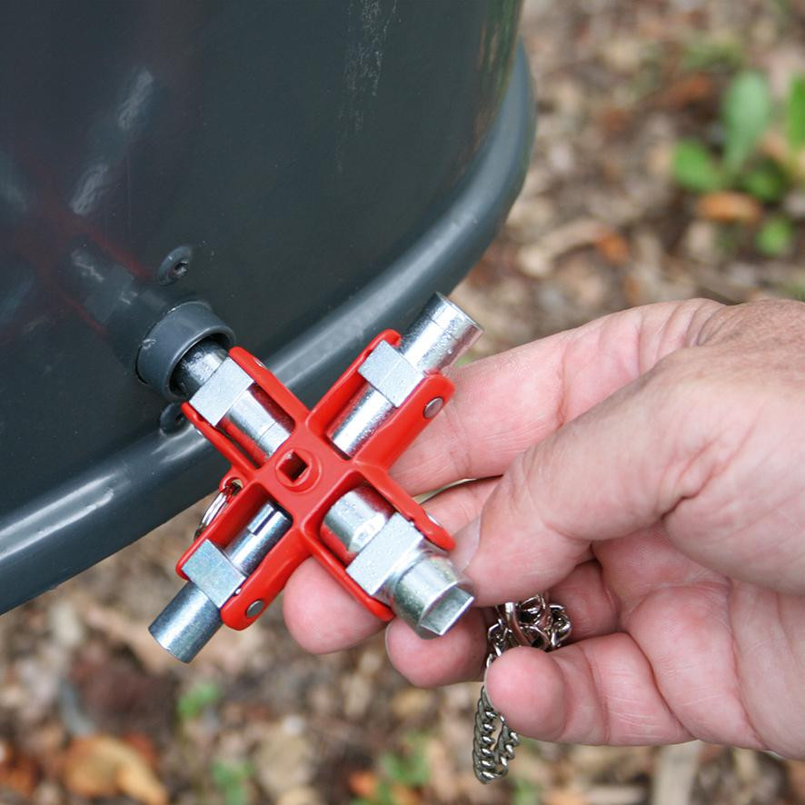 En forme de croix avec chaîne et mousqueton. Avec quatre pans mâle 6 mm, quatre pans mâle 7–8 mm et 9–10 mm, triangle mâle 7 mm, triangle mâle étagé 8–9 mm et 10–11 mm, double panneton 3–5 mm, demi-lune 6 mm et clé carrée pour vanne de radiateur 5 mm. Livré avec un adaptateur en plastique 1/4".